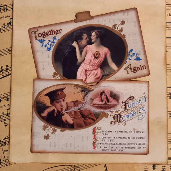 I used a WWI postcard of separated lovers to create a gusseted pocket and with a lot of digital trickery, I created a coordinating journal card of the reunited love birds💖.