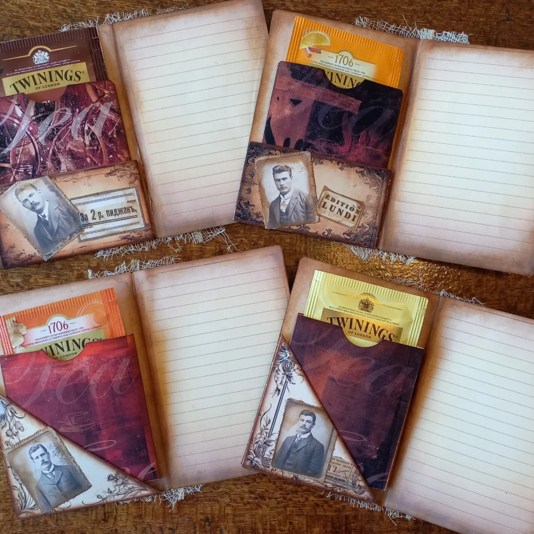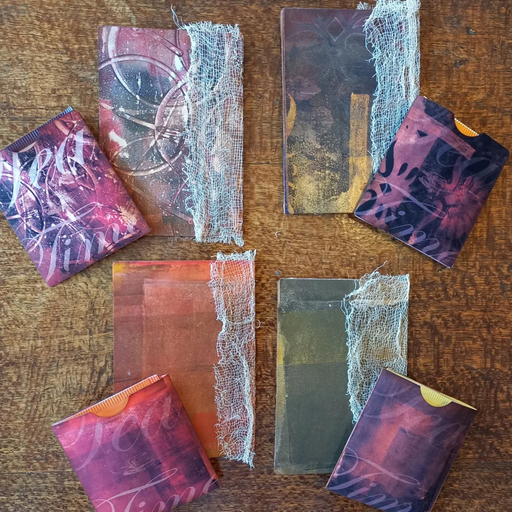 Using my gelli prints as backgrounds for the cards, I made tea-bag envelopes with the same design and tucked them into the card pockets.