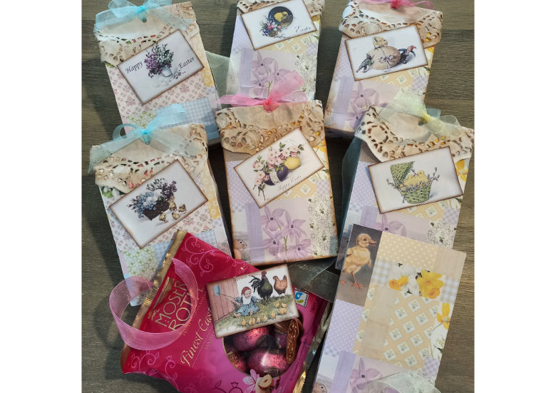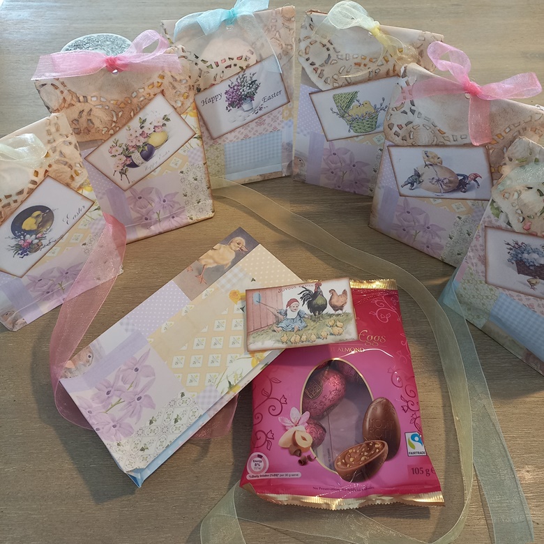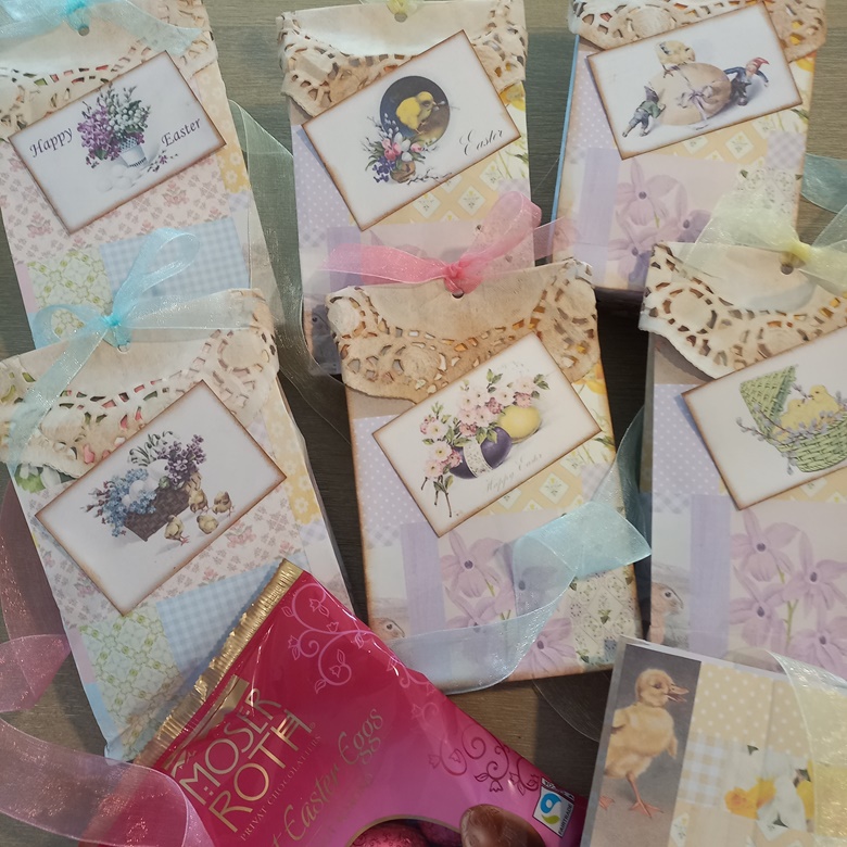 This year I made gusseted bags using a page from my “Nature’s Notes: Spring” FREEBIE. I topped them with coffee dyed paper doilies and added vintage Scandinavian Easter cards. They were simple to make but looked pretty cute. I filled them with chocolate truffle eggs. Everyone was pleased.