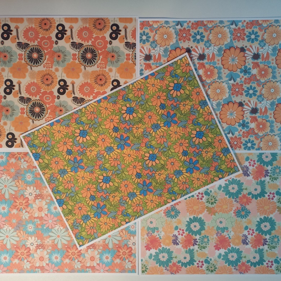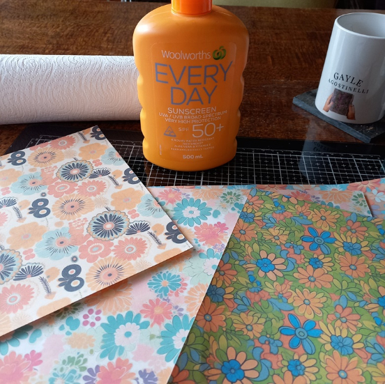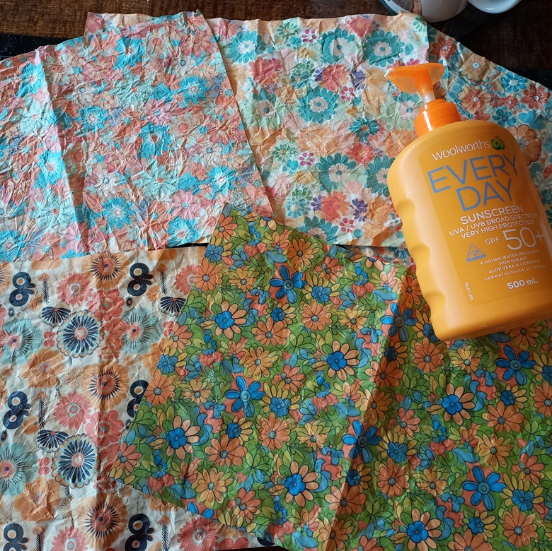 I’ve been playing around creating 1970s inspired fabric digitals 🌼, so I thought I’d print them out and have a go, using ‘expired sunscreen’, because surprisingly, I don’t have hand cream.