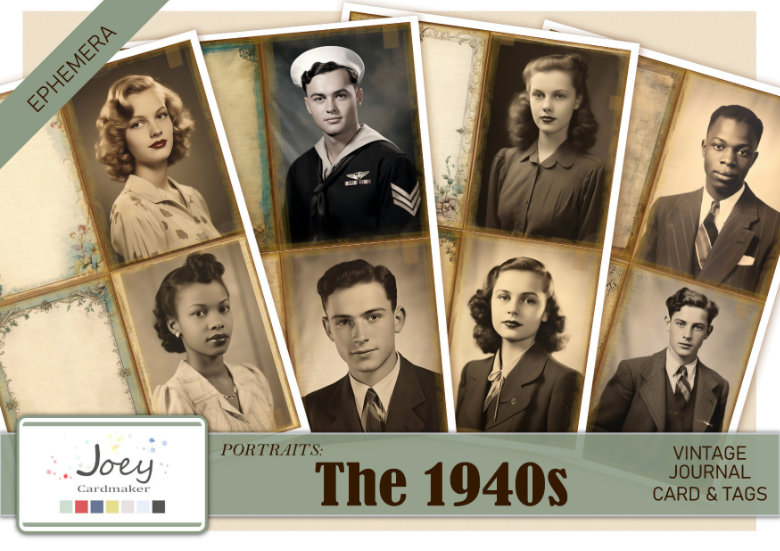 This digital ephemera kit is perfect for those who love the 1940s and want to add a touch of nostalgia to their journaling or scrapbooking projects. The kit includes faux reproduction photographic portraits of men, women, and couples from the 1940s. These photographs capture the spirit of the 1940s, a decade of war, progress, change and big bands.