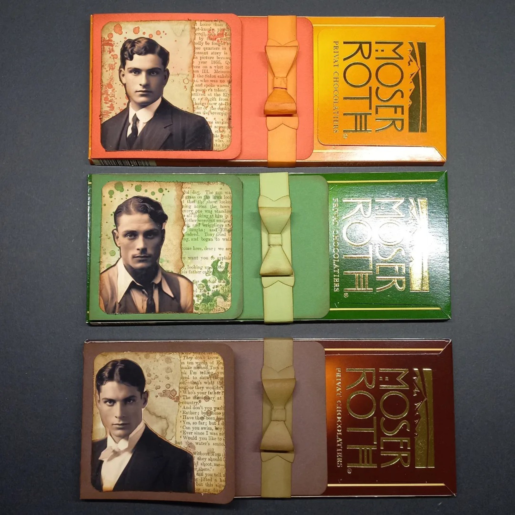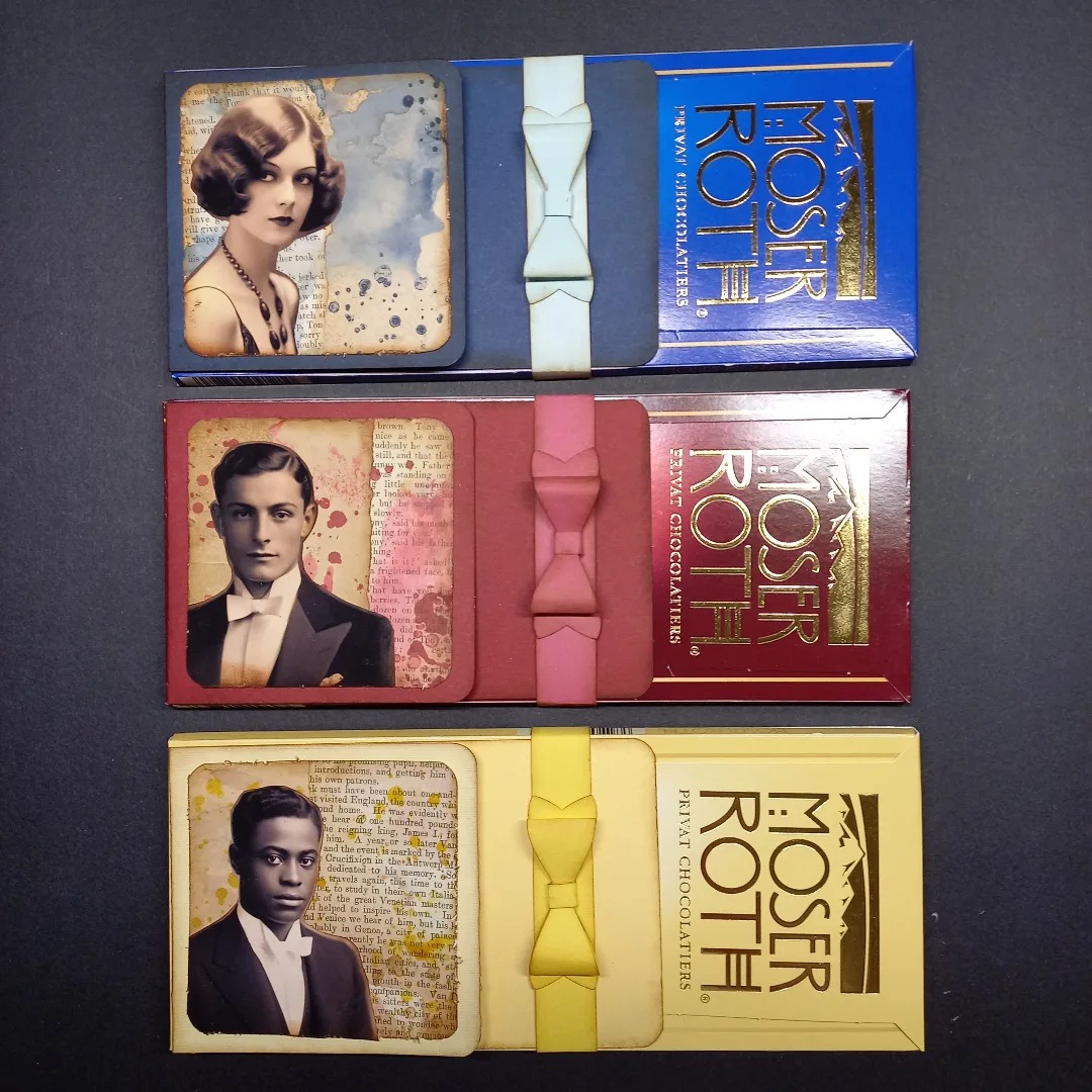 I had to make 6 birthday cards today for friends, ready for lunch on Monday, where we celebrate their September birthdays. Inspired by 2 Germans, the talented Marc @mydailymale and the Art Deco font and color range of Aldi’s Moser Roth Chocolate bars 😀. I ❤️Aldi.