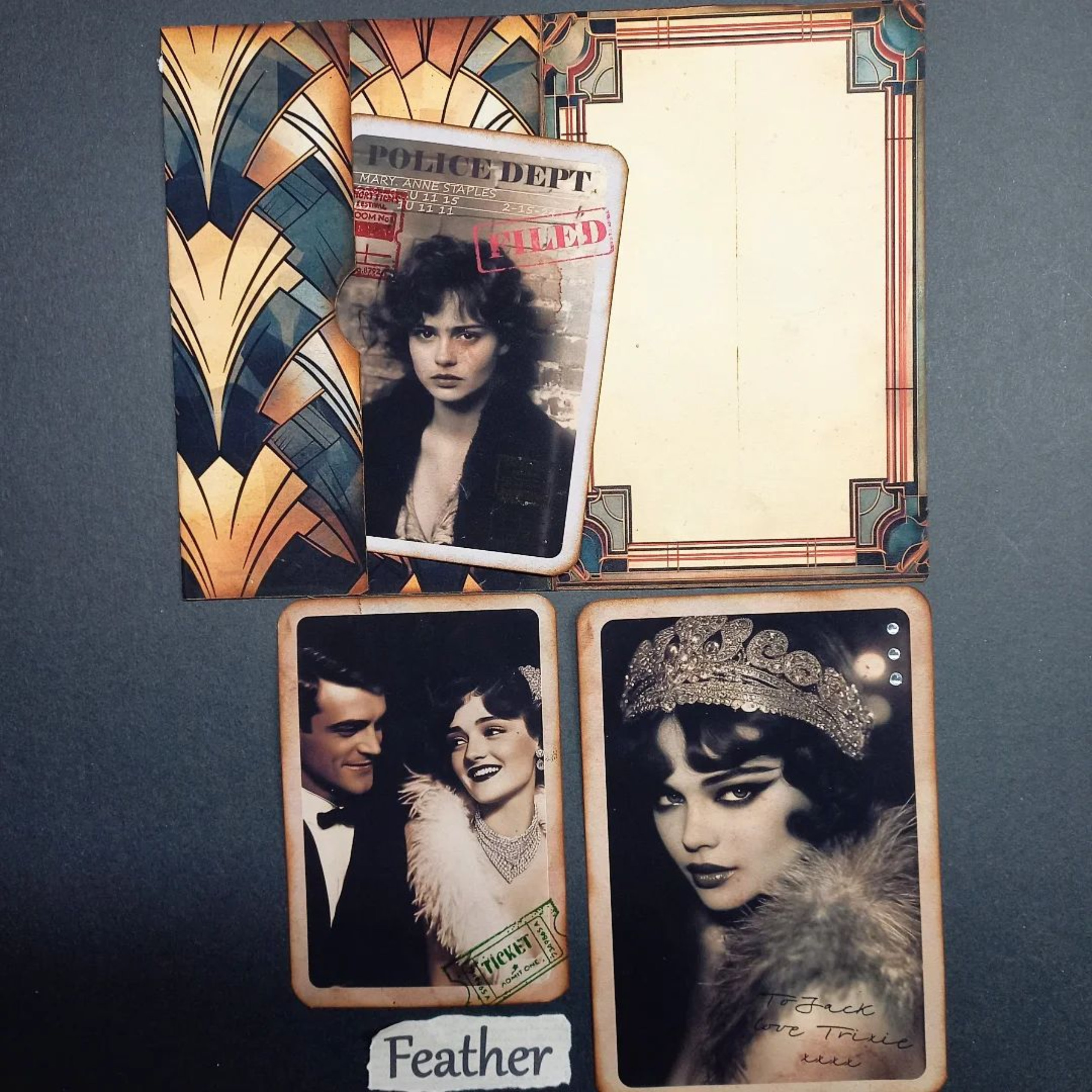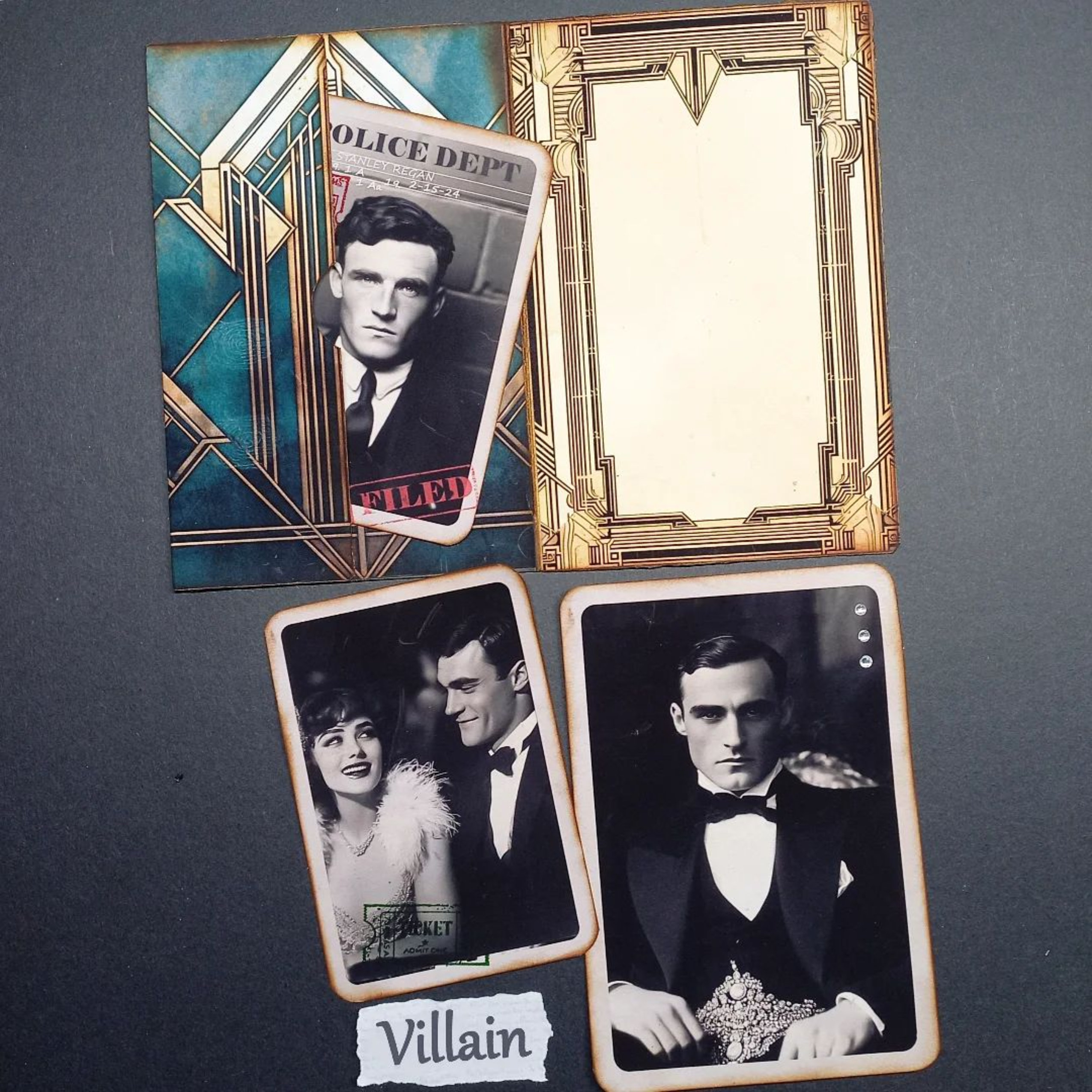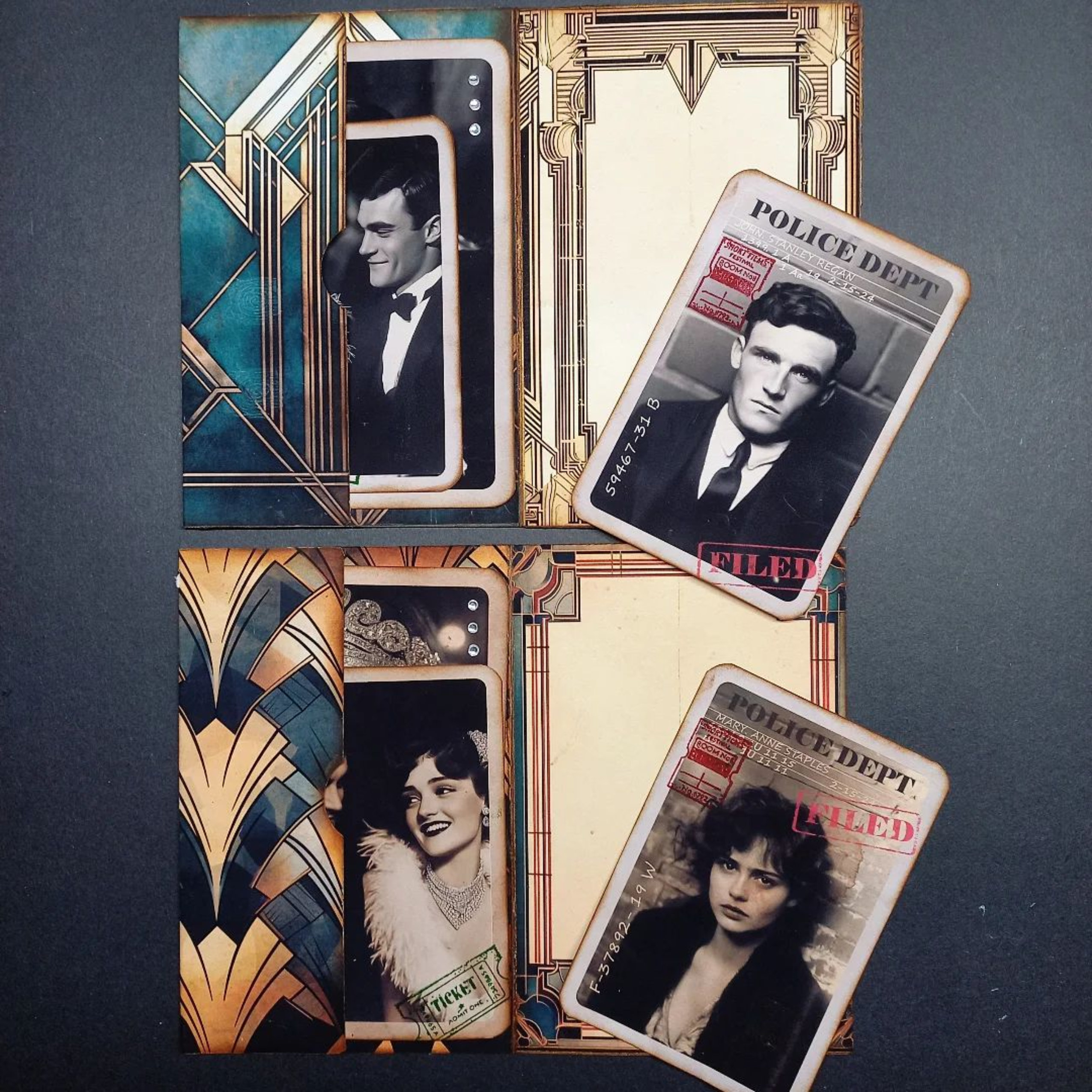 I made two journaling cards and used the faux newspaper front pages I created as the cover for the two cards. Inside I created some art deco designs for the linings, then made some small photo journaling Trixie and Jacks life together, including the final Police mugshots after their arrest.