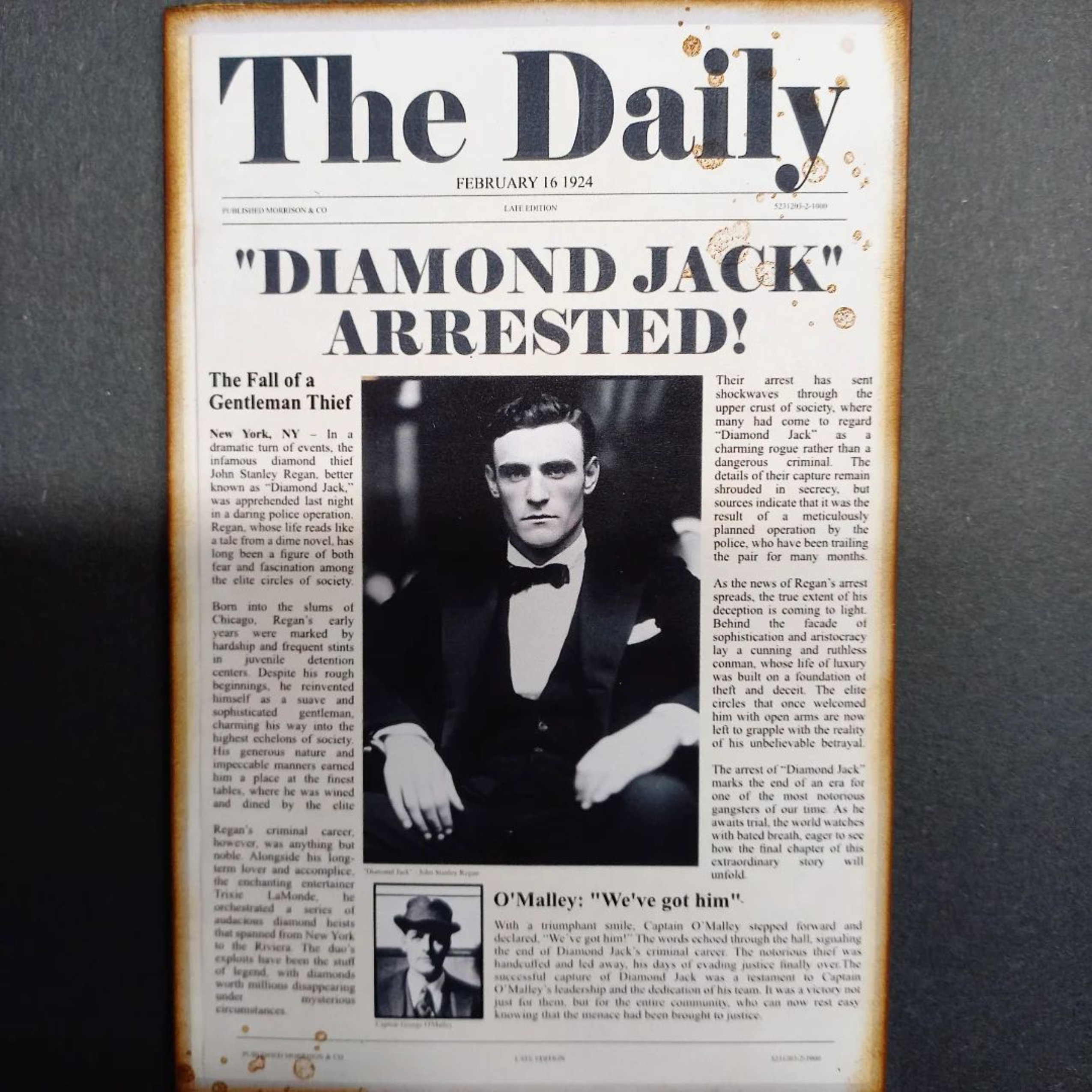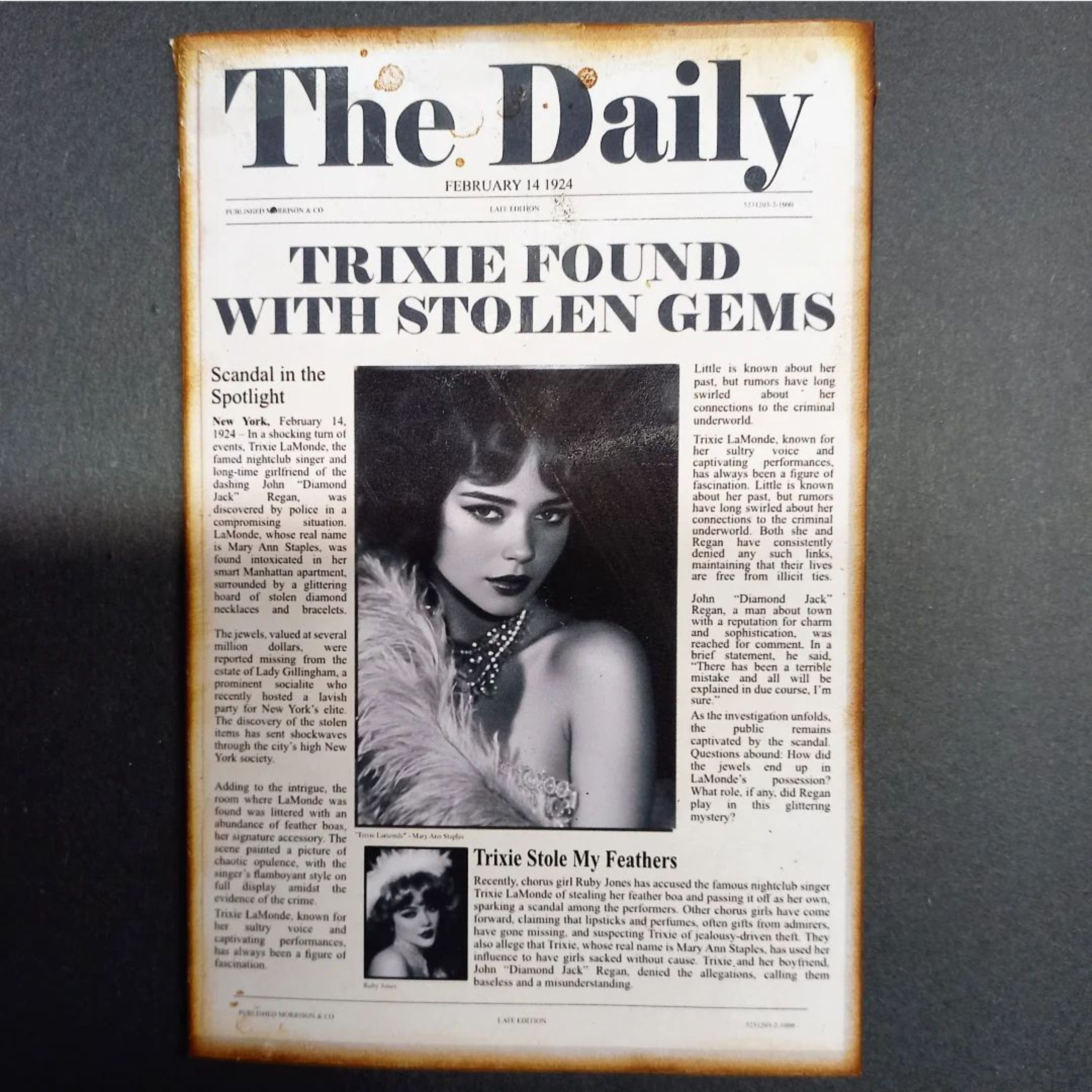 It’s just gone midnight here, and I’ve just finished this week’s challenge. It started with the idea of a feather boa on a flapper – and ended up a whole story about her con artist boyfriend “Diamond Jack” and their shocking arrest in 1924. I spent the afternoon writing the news articles that are impossible to read here without a magnifying glass