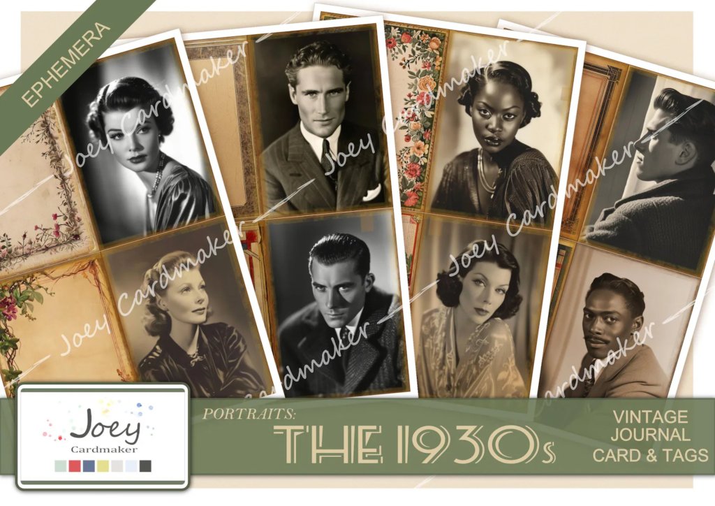 This digital ephemera kit vividly captures the essence of the 1930s, an era marked by elegance and resilience. The kit includes faux reproduction photographic portraits of men, women, and couples from the 1930s. These photographs reflect the spirit of a decade that navigated the complexities of the Great Depression, while still embracing timeless fashion, art deco influences, and cultural transformations.