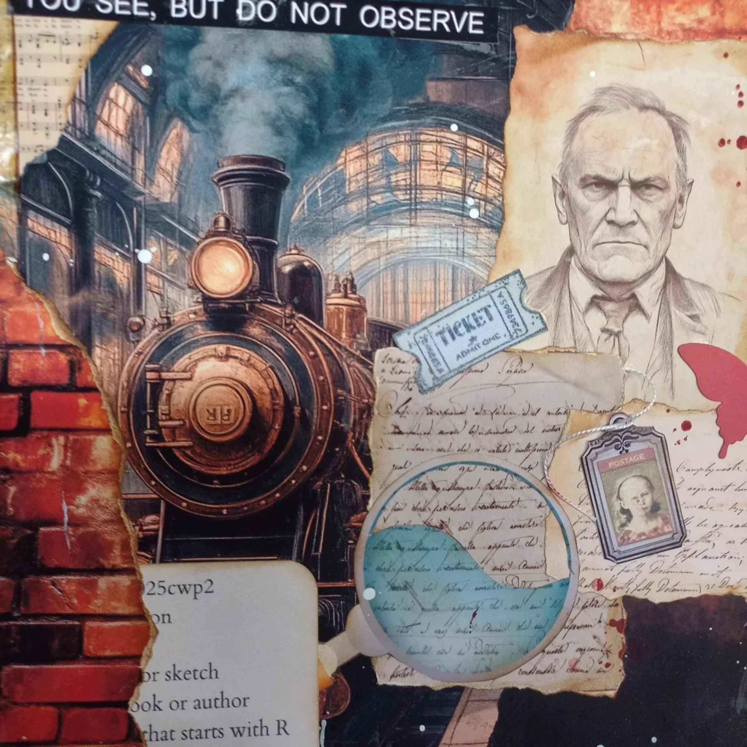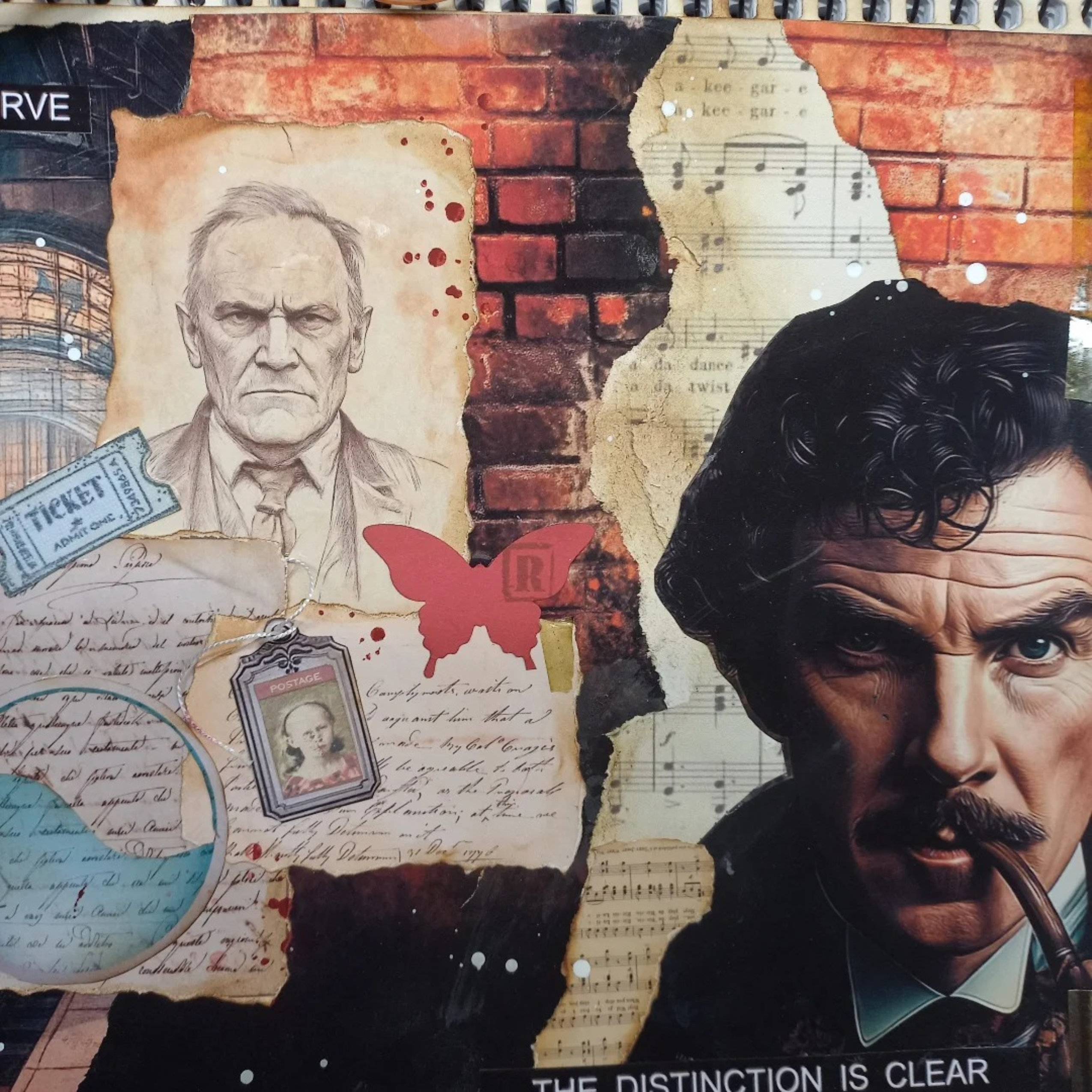 I then thought lets have a go at Margarete Miller’s 2025 collage challenge, and it was like a burst of sunshine through the cloudy start! 🌞 One of the prompts was to create a piece around ‘A favourite book’, so naturally, I channeled my inner detective and went with a Sherlock Holmes theme. 🕵️♂️🔍 With my art supplies scattered around and a hot cup of tea in hand, I found myself immersed in a world of creativity I’d almost forgotten. It was an absolute blast! 😃😃