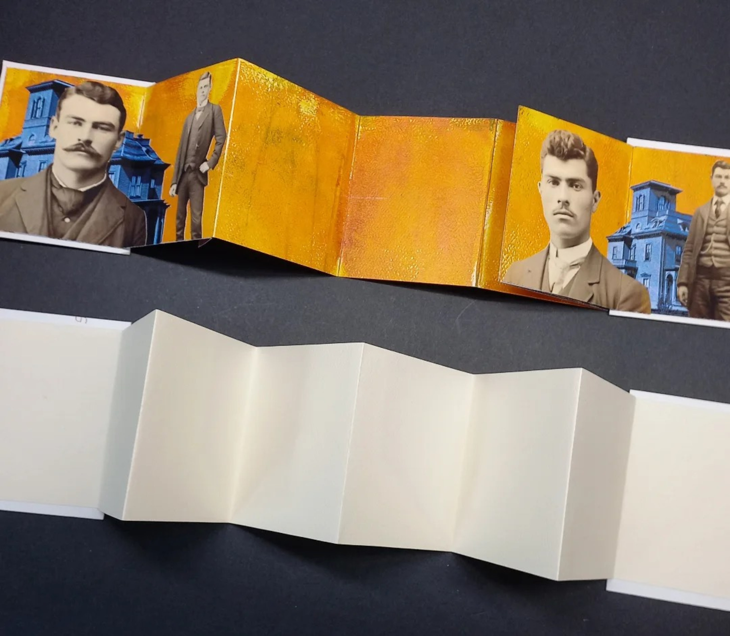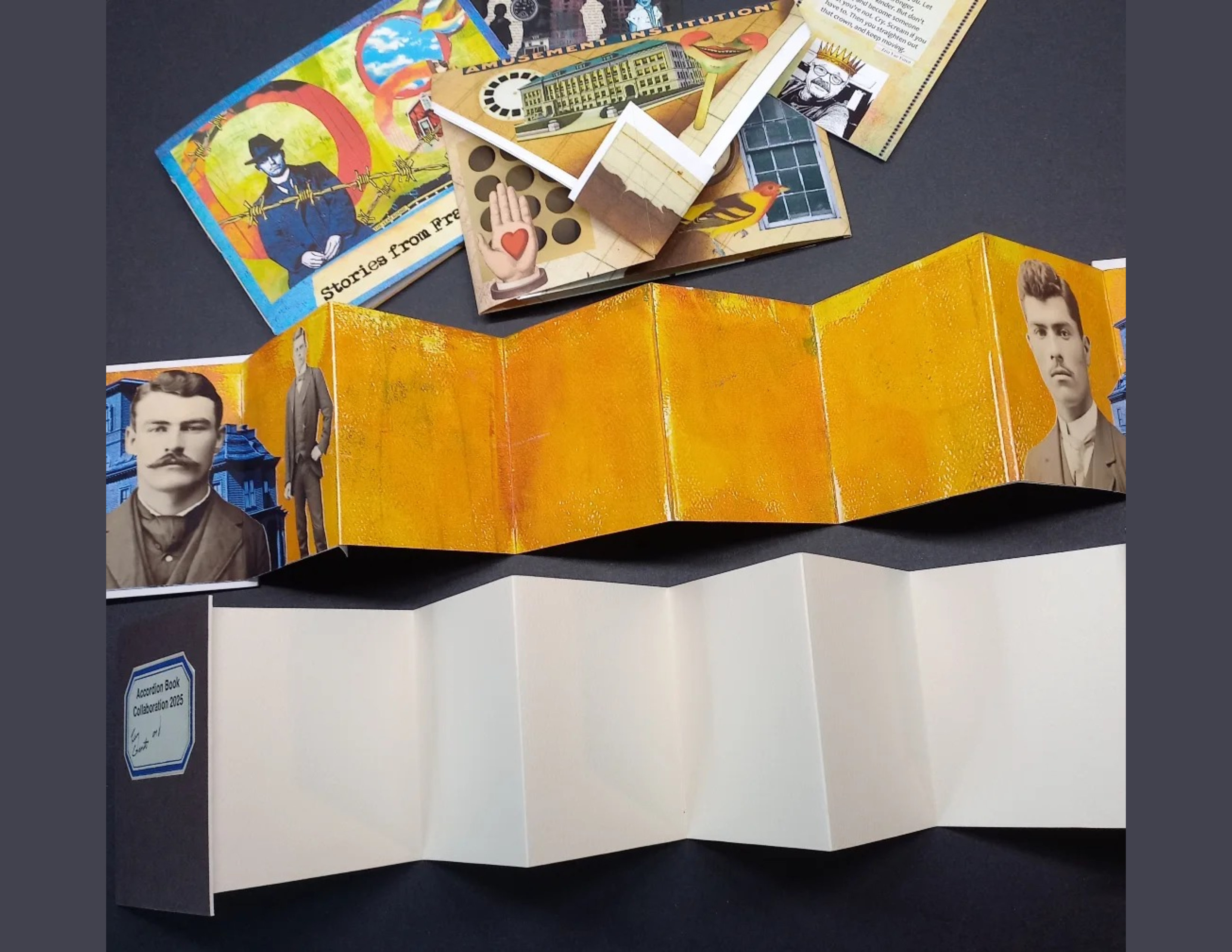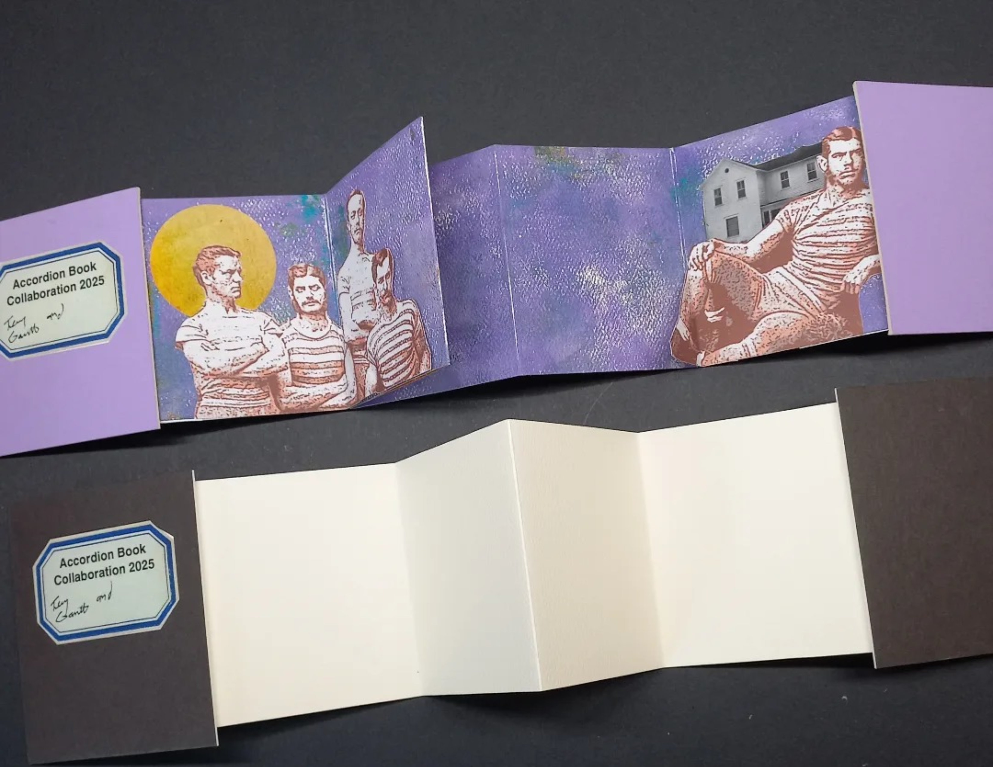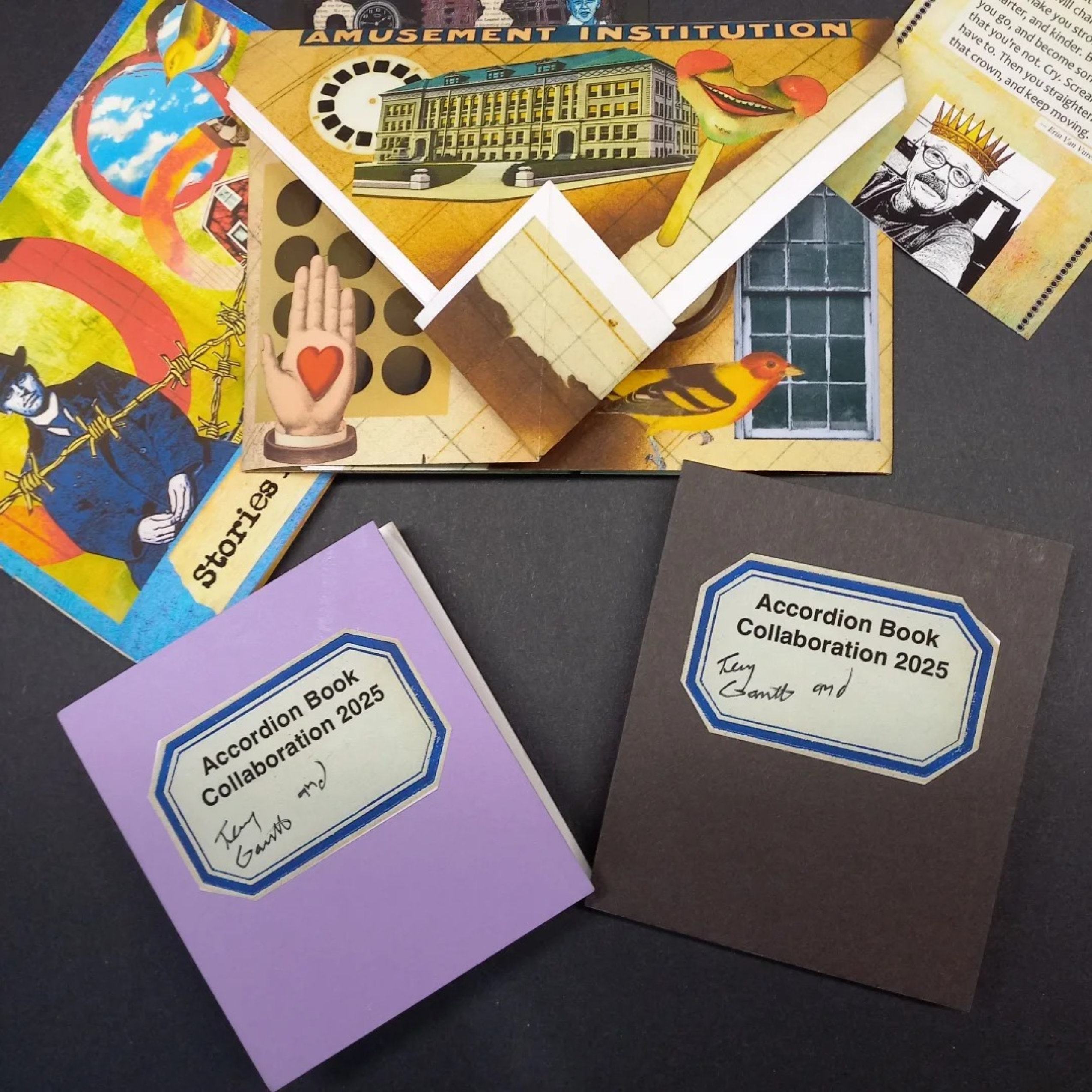 : Late last year, I was honored to be asked to collaborate with the remarkable collage artist Terry Garrett @terrygarrett763 on one of his Accordion Book projects. Today, my package arrived from the USA, filled with wonderful treasures from Terry. There are two books: a purple one Terry started, which I’ll finish and keep, and a blank black one I’ll start and return to Terry to finish and keep.