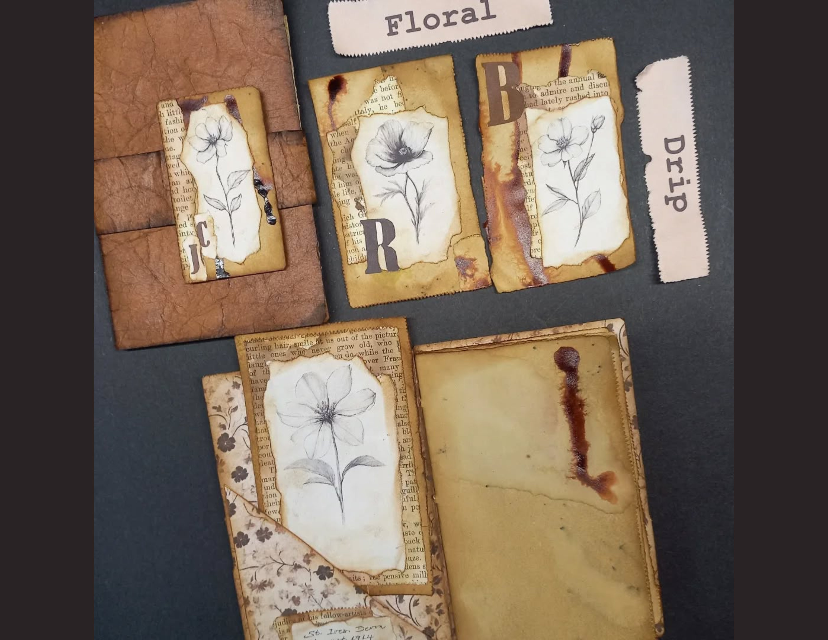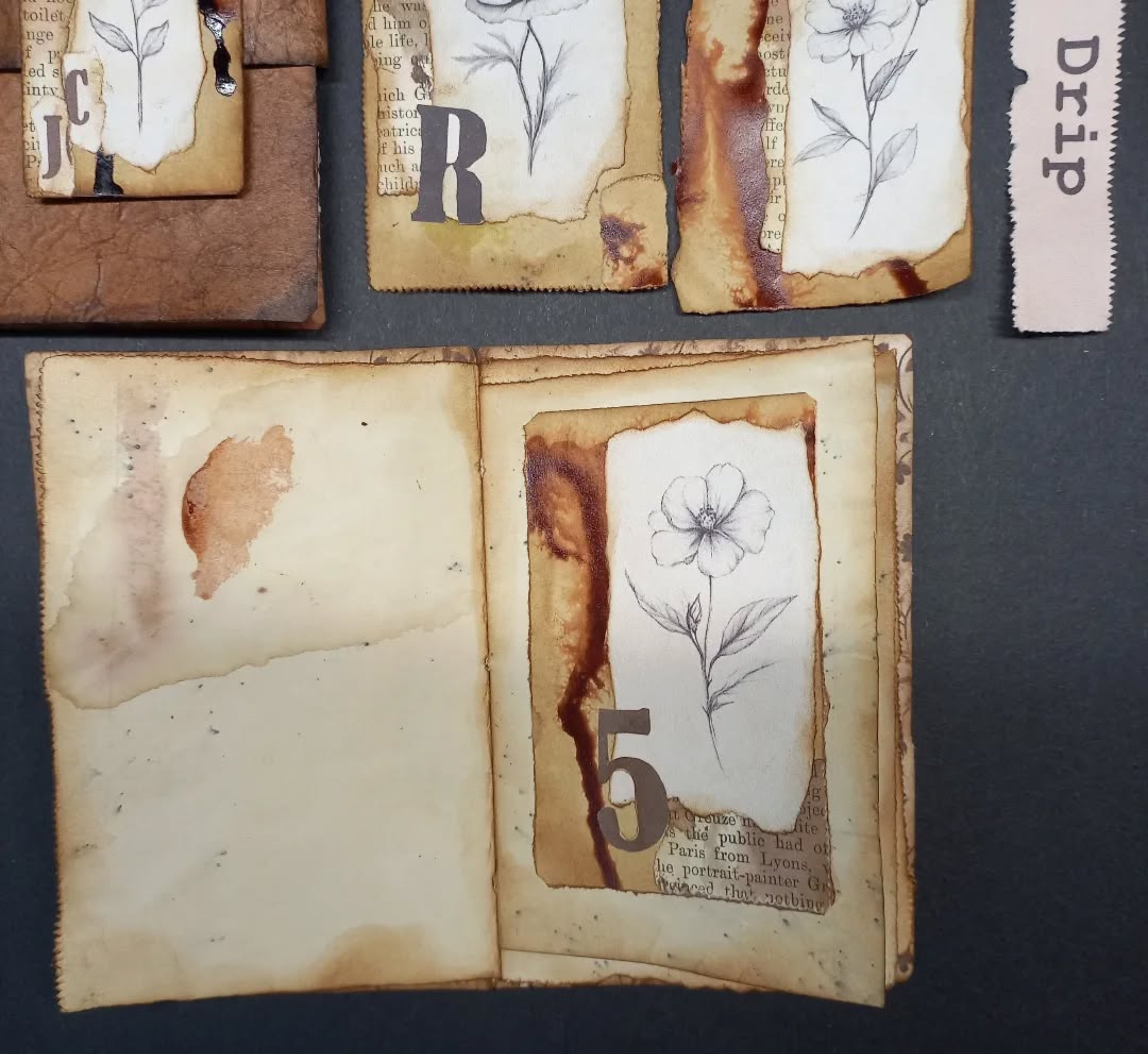 To add some personal flair, I made inky drippy clusters and included flower pencil sketches on random pages throughout the notebook. The sketches added a whimsical element .