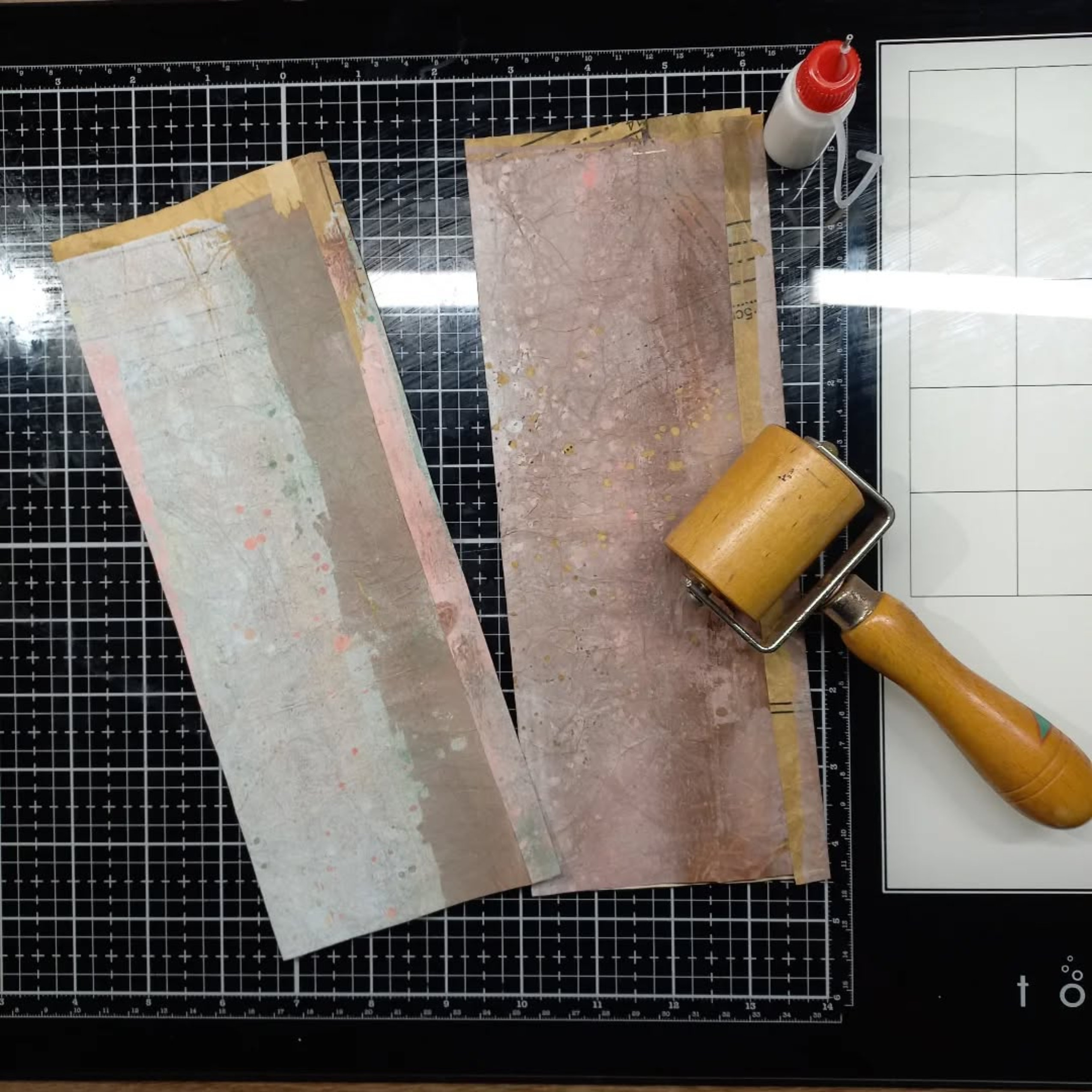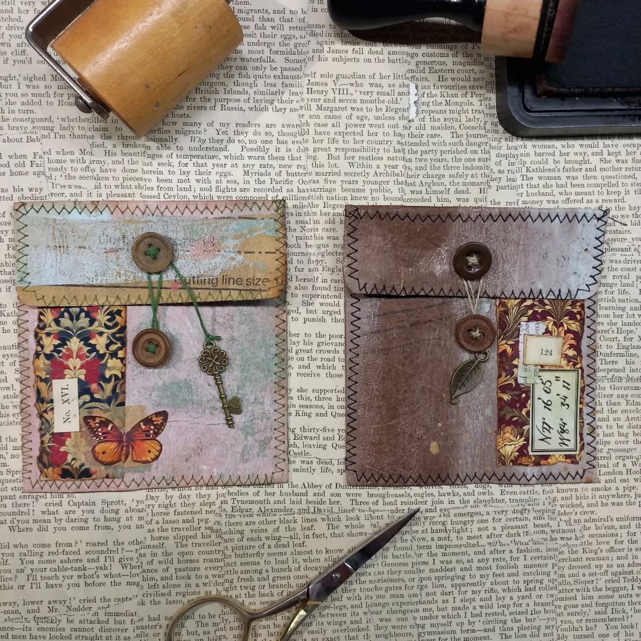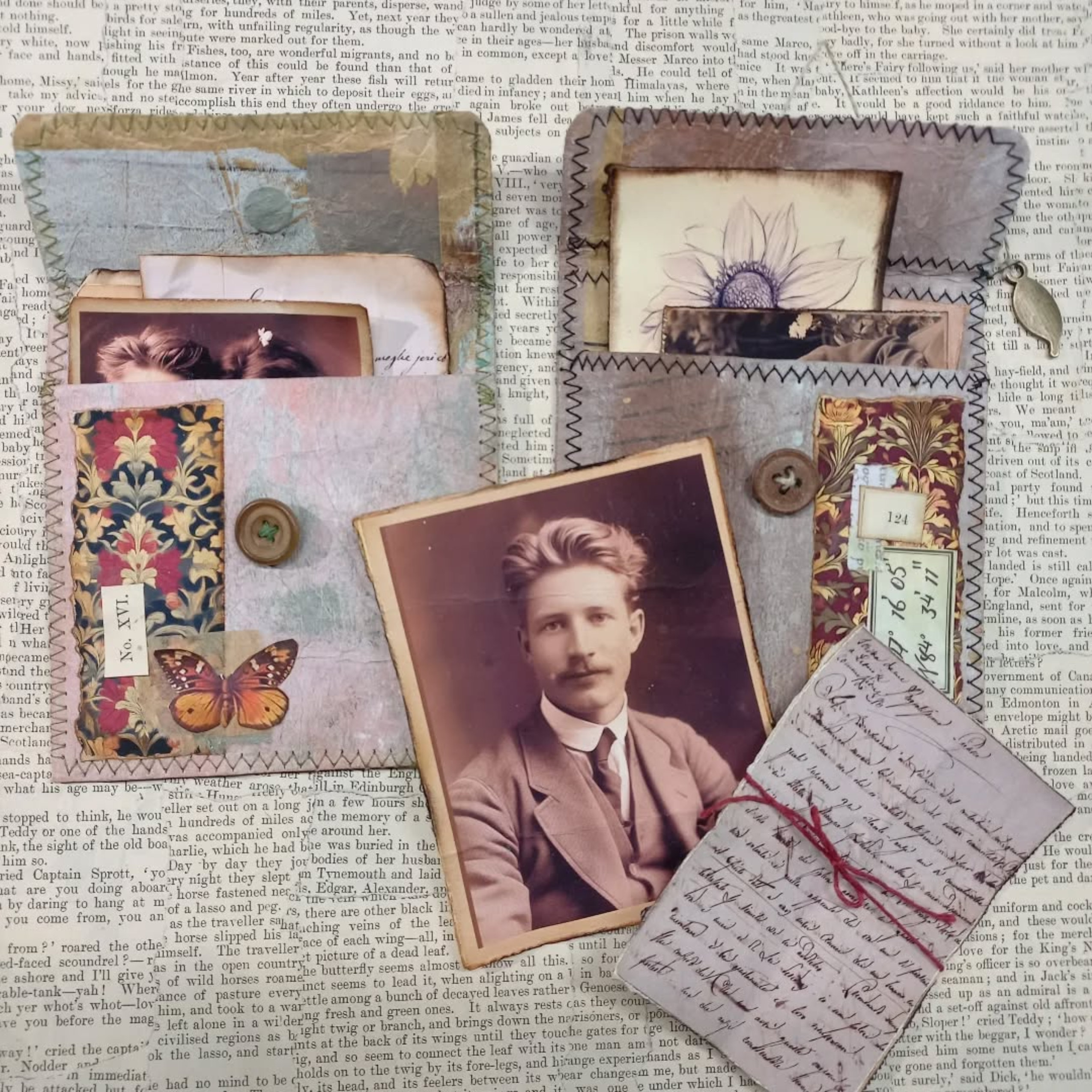 I made these ephemera pouches from gelli printed sewing pattern paper and momigami . It’s like sewing fabric. I’m building a story through ephemera for my journal about a group of Edwardian Bohemian friends set in the summer of 1914. These two were lovers, a writer and an artist. Their last summer before war came.